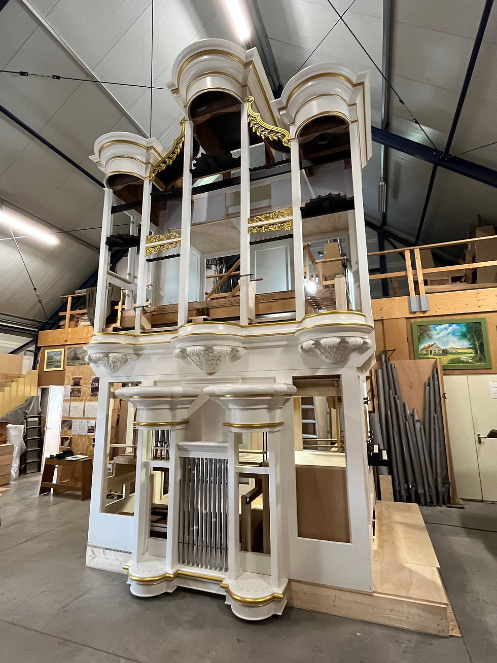 Inmiddels wordt er druk geschilderd aan diverse onderdelen van de orgel kas, en het houten pijpwerk van de subbas 16', die straks op het pedaal komt. Ook zijn er nieuwe delen van het sierfront gereed.